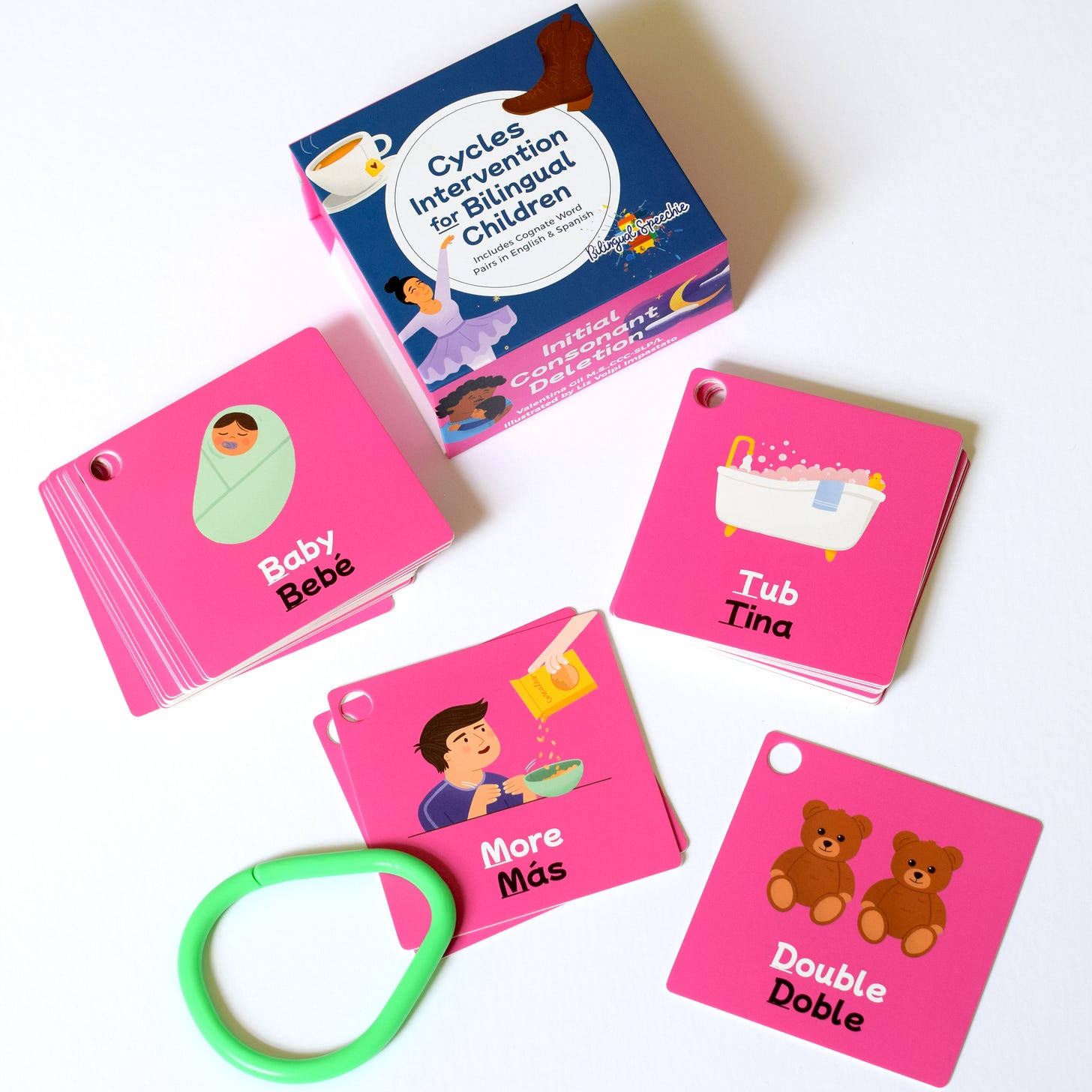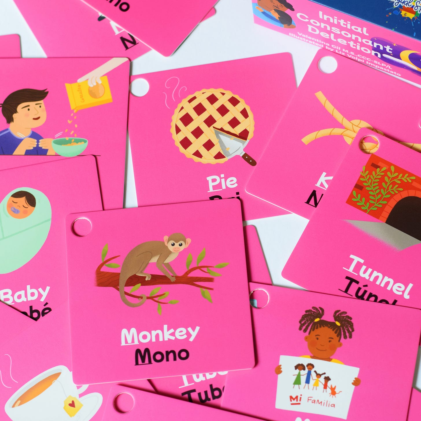 For this deck, Liliana collaborated with fellow SLP, Valentina Gil, who developed it to follow the phonological intervention method called the Cycles Approach. These particular cards focus on initial consonant deletion—helping bilingual kids who have the tendency to skip pronouncing consonants at the start of words.